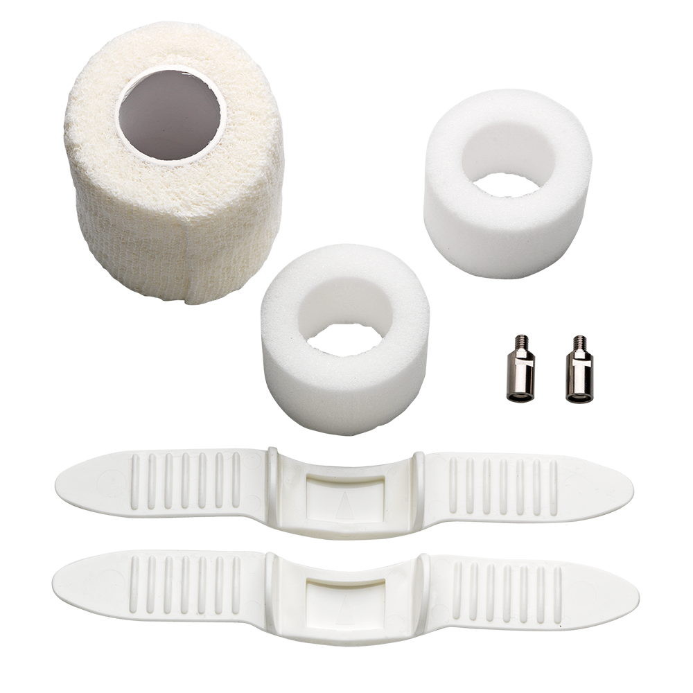 2 Rubber Straps (white), 1 set of 1/2 inch elongation bars, 2 Protection Pads and 1 Cohesive Gauze.