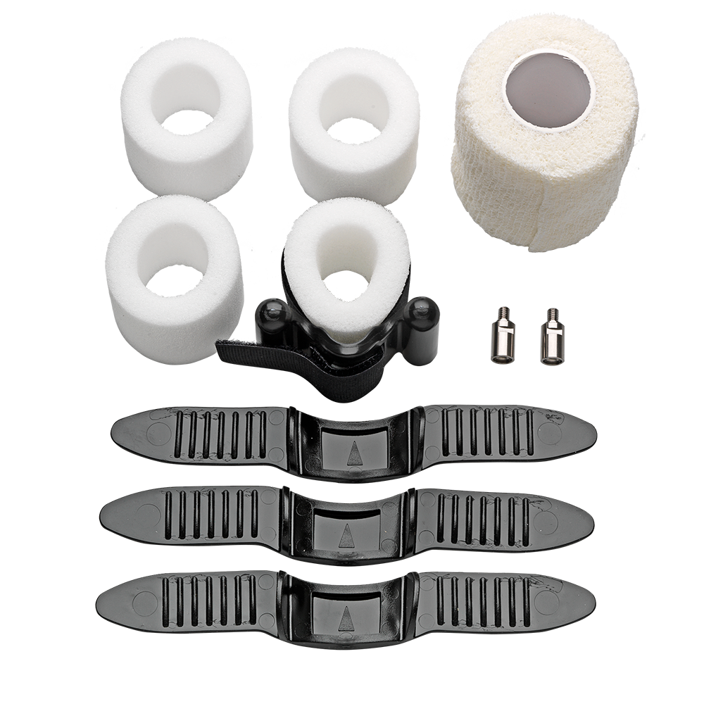 3 Rubber Straps (black), 1 set of 1/2 inch elongation bars, 3 Protection pads, 1 Velcro Strap and 1 Cohesive Gauze.